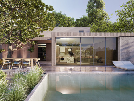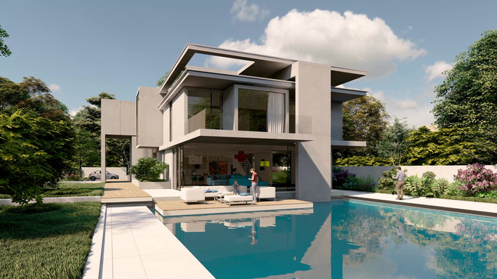 La magnifica villa con copertura piana ritratta nel videorender sottostante è esaltata dall'utilizzo di volumi a sbalzo sulla piscina immersa nel verde. L'utilizzo di viali di cemento bianchi per la sistemazione esterna perimetrale alla piscina invita il visitatore a scoprire l'intero progetto.